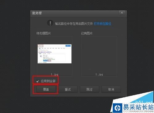 7、在新的對話框中,勾選“應用到全部”,點擊“覆蓋”。