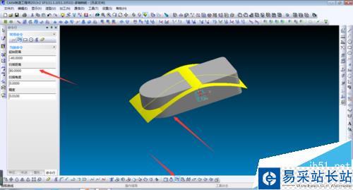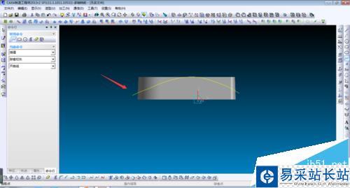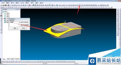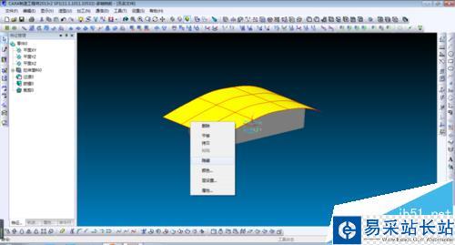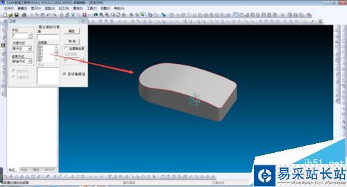 5、然后選擇曲面裁剪除料,選取剛剛生成的曲面,選擇剪裁方向朝上,將上面部分實體剪掉。最后選擇曲面和曲線,點擊右鍵/隱藏。