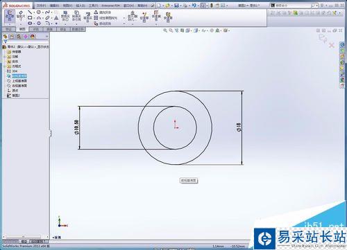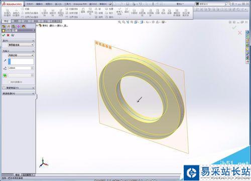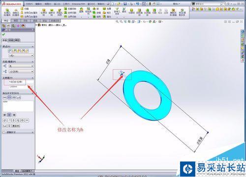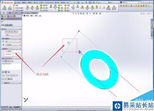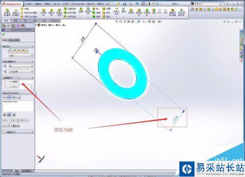 1、新建零件,以上視基準面繪制草圖,畫兩個同心圓,標注尺寸,對稱拉伸,以公稱規(guī)格10為例。內徑d1=10.5mm,外徑d2=18,厚度h=1.6。拉伸好后統(tǒng)一將三個尺寸的名稱修改為標準上的名稱。
