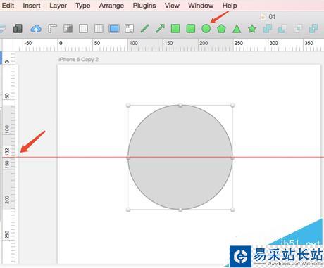2、選中圓形工具在畫板上畫一個正圓,橫坐標參考線沿著標尺邊緣移動到圓形中間的位置點擊一下,參考線就出來了。