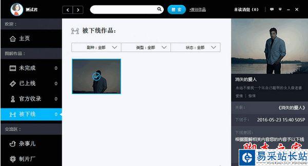 8.在“被下線”的分類,可以查看自己被官方和自己下線的作品的信息。