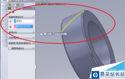 3、如圖做一條緊貼側面的螺旋線,這條螺旋線是作為拉伸切除的引導線