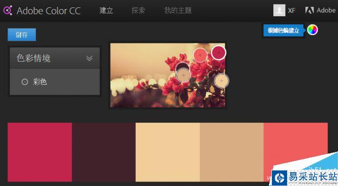 這里,小編則點擊右上方的相機圖標,選擇“根據(jù)影像建立”。在打開的對話框中,選擇作為背景的圖片,很快就會上傳到網(wǎng)站,網(wǎng)站依此圖片的色彩構成,自動給出一個配色方案。點擊“色彩情境”,從下拉菜單中為此配色方案選擇不同的風格,比如亮色、柔和、深色、暗色等,根據(jù)自己的需要選擇。