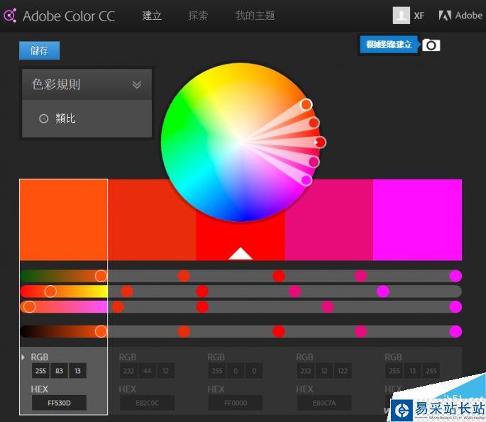 打開網(wǎng)頁后即是一個配色編輯界面,點擊“色彩規(guī)則”,從下拉菜單中根據(jù)實際需要可以選擇類比、單色、三元色、補色、復合色等多種配色方案。可以直接使用這些色彩,界面下方,有每種顏色的RGB數(shù)值以及對應的16進制表示(HEX)。也可以拖動色彩輪上的顏色點,設置為自己想要的顏色。