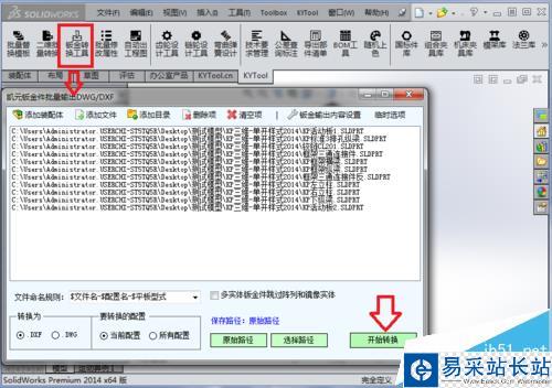 7、鈑金件自動(dòng)批量展開并輸出DWG、DXF加工圖的方法:通過(guò)KYTool插件的鈑金轉(zhuǎn)換工具,將鈑金件拖到上方的列表中,然后點(diǎn)擊下方的“開始”按鈕就會(huì)自動(dòng)完成。