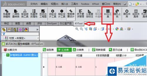 2、在SolidWorks插件中找到KYTool,打開其BOM工具,如下圖所示 ,然后點(diǎn)擊窗口右上角的“重要設(shè)置”按鈕