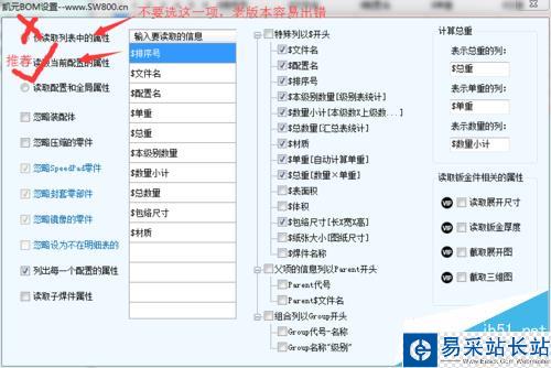3、打開BOM屬性設(shè)置窗口,如下圖,選中紅色框中的選項(xiàng),主要是讀取鈑金件的展開尺寸,獨(dú)步鈑金厚度,鈑金展開后截圖,鈑金非展開狀態(tài)截圖等信息。