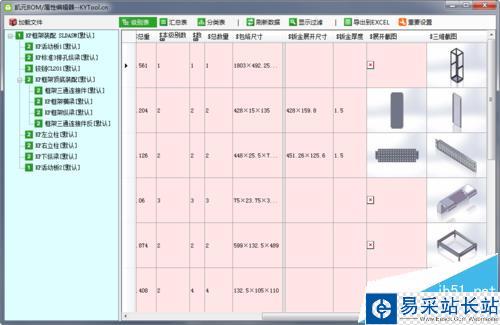 4、設(shè)置完成后保存,然后重新打開KYTool插件工具條的“BOM工具”按鈕,打開如下窗口,可以看到窗口中已經(jīng)讀取了當(dāng)前裝配體的所有的數(shù)據(jù),如鈑金展開尺寸,鈑金厚度,鈑金展開截圖,三維截圖,包絡(luò)尺寸,文件名稱,以及所有的屬性。