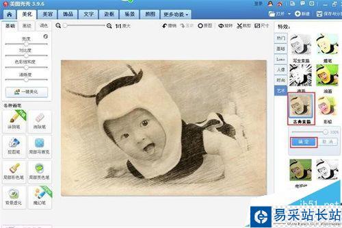 4、我們現(xiàn)在要把這張彩色照片制作成古典素描的圖片,我們?cè)?ldquo;美化”圖片的頁(yè)面右側(cè)看到有“特效”窗口,如下圖所示