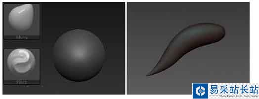 1、在Tool工具面板上,插入球體并在工作區拖拽鼠標繪制,單擊“Edit”進入編輯模式,單擊“Make PolyMesh3D”按鈕,為了方便觀察,您可以更換材質。使用“Move [移動]”筆刷來獲得所需的形狀,切換至“Pinch [捏擠]”筆刷,收縮模型的表面,將邊緣逐漸捏尖,如下圖所示。