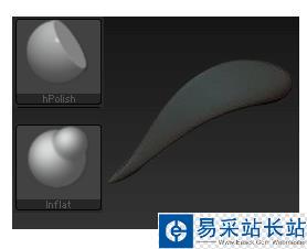 2、使用“hpolish”筆刷來刷出兩側和根部的頭發部分,為了體現頭發質感有軟硬變化,就用這個筆刷塑造一些稍微硬、平整一點的效果。使用“Inflat”筆刷讓頭發從根部開始飽滿起來,并確保它逐漸變薄。