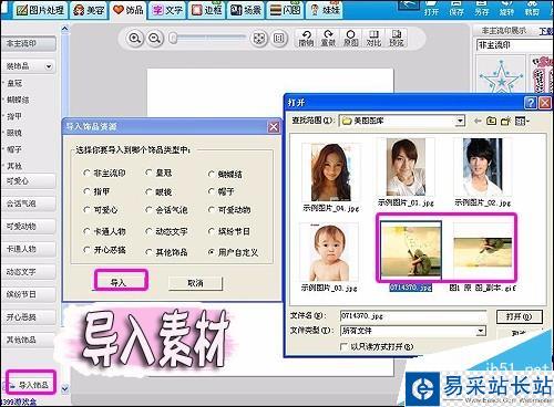 5、然后進入“飾品”菜單下,將原圖和倒影的圖片導入到“用戶自定義”中。