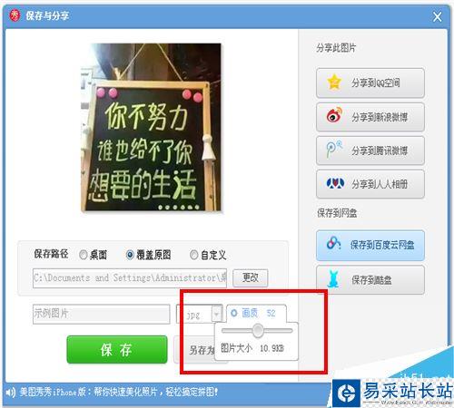 在彈出的保持對話框中,調整畫質,將畫質稍微調小有點,當然如果照片要求比較高的話不要調太小哦,因為調太小會影響照片的質量。