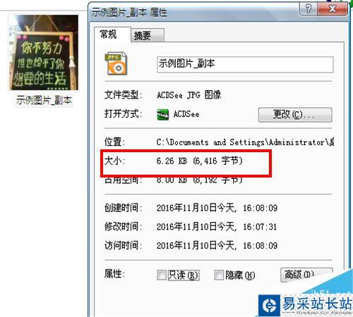 保存后,選中照片,單擊右鍵屬性,查看修改后照片的內存,大小只有6.26KB,是不是縮小了很多呢。