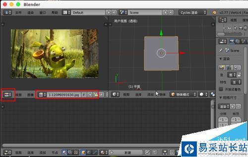 3、頂部的3d視圖左邊角“三角形”鼠標(biāo)按住向右邊拖拽一個(gè)窗口,切換為“UV/圖像編輯器”窗口,并打開一張貼圖圖片。