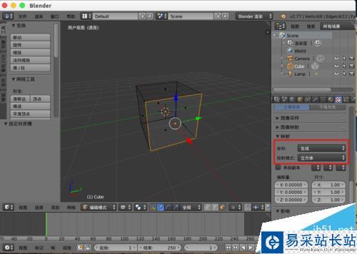 6、在“映射”中,坐標(biāo)設(shè)置為“生成”,投射模式設(shè)置為“立方體”。