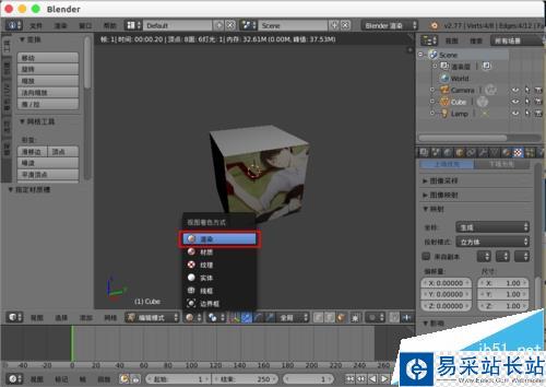 8、然后我們選擇底部的“渲染”,發(fā)現(xiàn)我們圖片已經(jīng)貼到這個(gè)面上了。