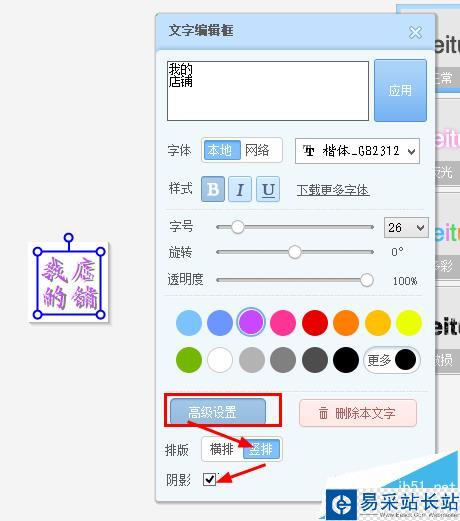 6、單擊”高級(jí)設(shè)置“,即可跳出”排版和陰影“,根據(jù)自己的要求,選擇,如圖;