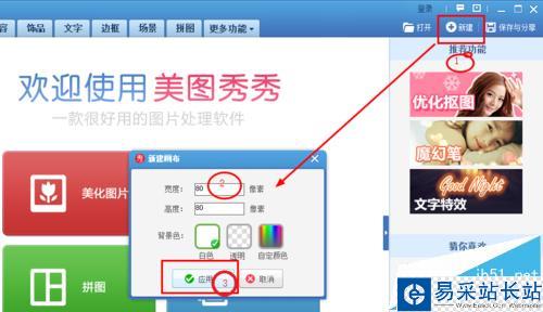 3、找到右上角的“新建”按鈕,單擊,新建一個(gè)80x80畫(huà)布,單擊“應(yīng)用”,即可;具體操作如圖序號(hào)所示;