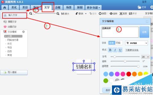 4、單擊“文字”,找到“輸入文字”,在彈出的“文字編輯框”中,輸入你的淘寶店鋪名稱(chēng),比如“我的店鋪”,過(guò)程如圖中編號(hào)所示;