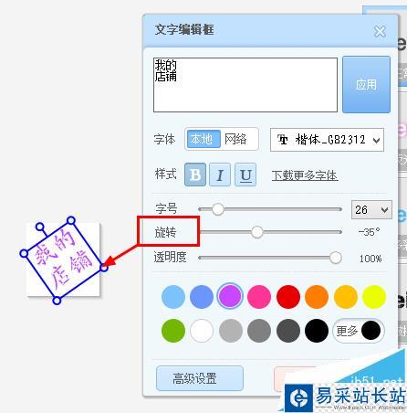 5、調(diào)整文字大小和顏色,是否旋轉(zhuǎn),有無(wú)透明度等,隨意即可;如圖: