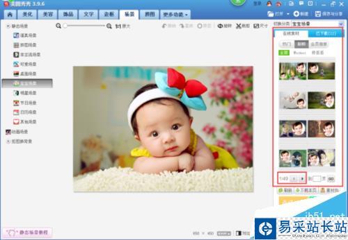 9、我們?cè)?ldquo;寶寶場(chǎng)景”的"在線素材"窗口中找我們想要的場(chǎng)景,我們看到素材顯示有1/49,就是說(shuō)現(xiàn)在有49頁(yè)素材可供我們選擇,如下圖所示