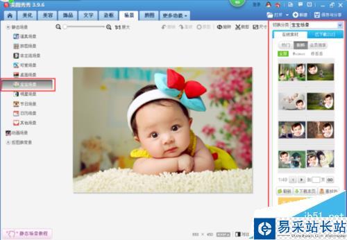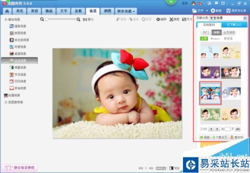8、我們點(diǎn)擊“寶寶場(chǎng)景”,在“場(chǎng)景”的頁(yè)面右側(cè)視圖中我們看到彈出了“寶寶場(chǎng)景”的素材窗口,如下圖所示