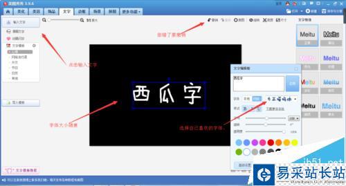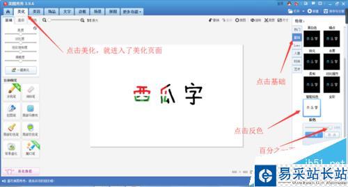 4、各位寶寶們這是最后一步了堅持,點擊美化,進入美化界面,目光轉向右方編輯欄,點擊基礎,選擇反色,這樣西瓜字就做好了!!!這樣的字體是不是感覺萌萌噠!為完整西瓜字體效果圖