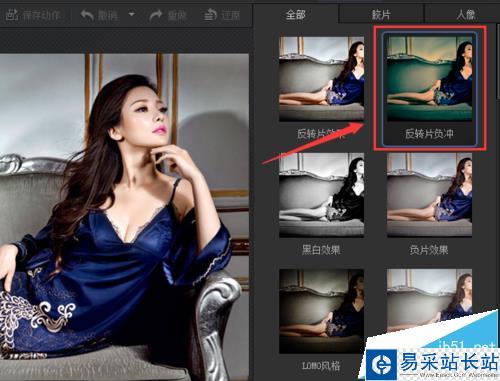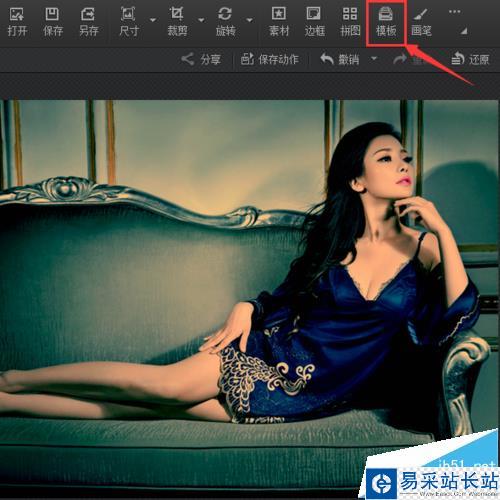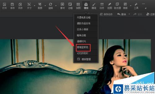 7、點擊反轉片負沖選項,我們的圖片自動添加該效果,然后在上面的菜單區找到模板選項,如圖所示: