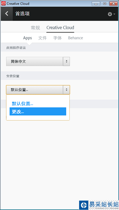 點擊首選項,然后選擇Creative Cloud選項卡,下面的安裝位置就可以更改安裝程序的默認位置,以后通過這個軟件安裝程序就會被默認安裝到別的盤!