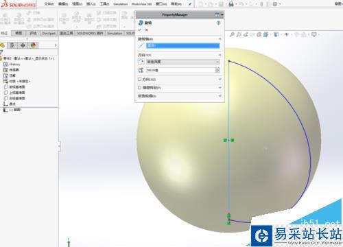 5、 繪制完草圖之后,在“草圖”選項卡中選擇“旋轉(zhuǎn)凸臺./基體”命令,并選擇豎直線為旋轉(zhuǎn)軸,選擇草圖為球體