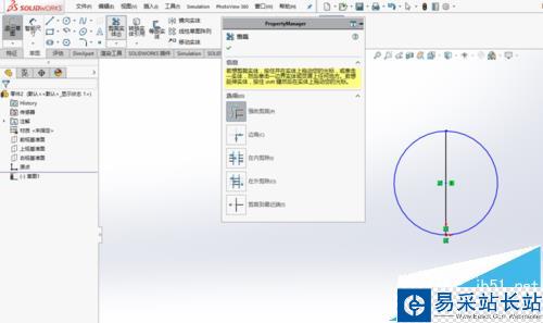 4、然后,在“草圖”選項卡中選擇“裁剪實體”命令,用“強勁剪裁”裁剪一半的圓
