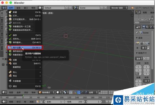 1、打開blender按“ctrl+alt+u”鍵,或者“文件”--“用戶設置”。