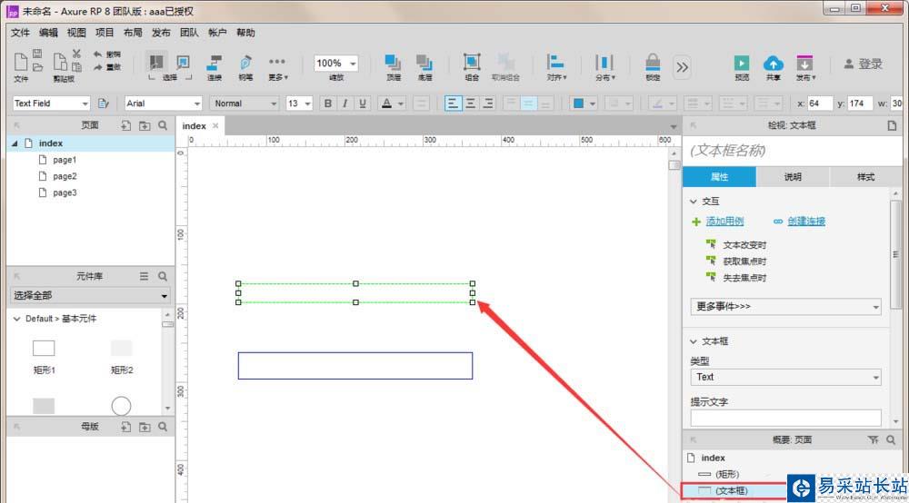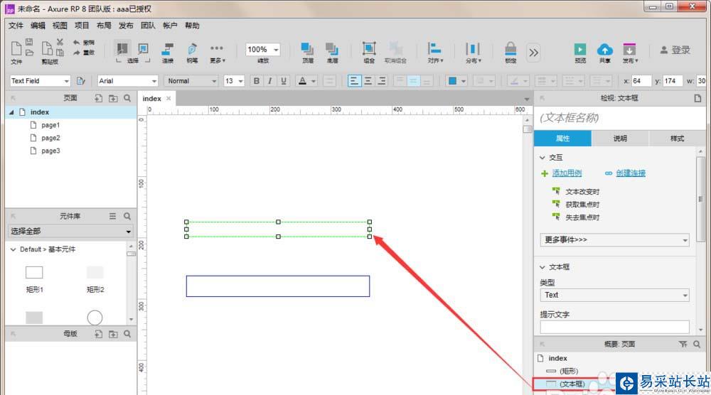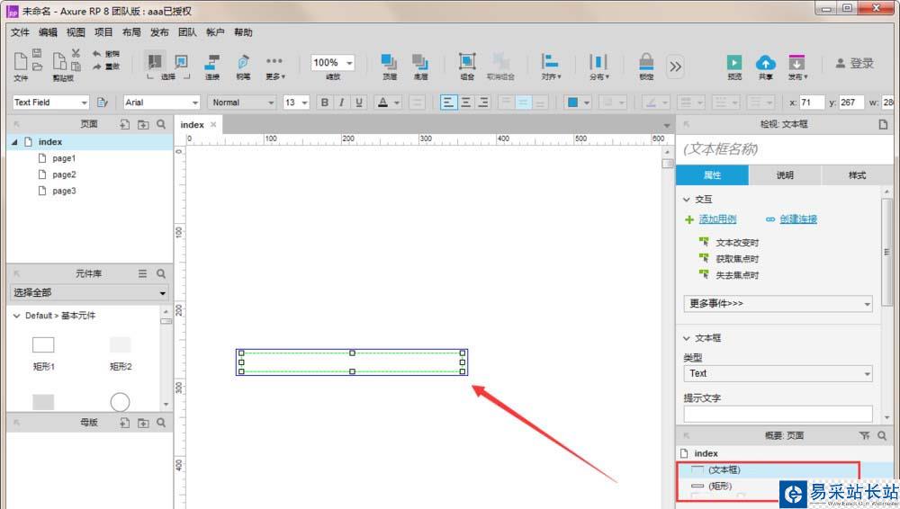 1、打開axure軟件,在窗口左側元件庫中向面板拖入一個文本框。