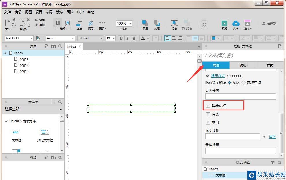2、選中拖入的文本框,到窗口右側 “屬性" 將 "隱藏邊框" 選項勾選。