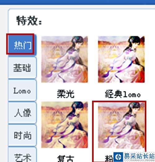3、在美圖秀秀中單擊美化中在特效,在特效的熱門中選擇單擊粉紅佳人。