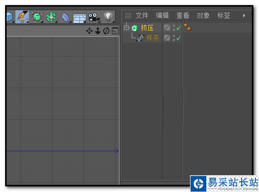 2、按ALT鍵,添加擠壓,使到樣條成為擠壓的子級(jí),如圖中所示。這時(shí),樣條是沒(méi)有厚度的。我們切換回透視視圖,就看到。