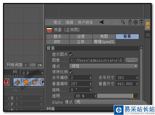 2、在網(wǎng)上找到一張花瓶的圖片,截圖出來并把圖片導(dǎo)入到C4D中,圖片導(dǎo)入后,把圖片大小調(diào)節(jié)好,再調(diào)好位置,水平偏移、垂直偏移;再把透明度調(diào)低些,這樣方便等下描繪。