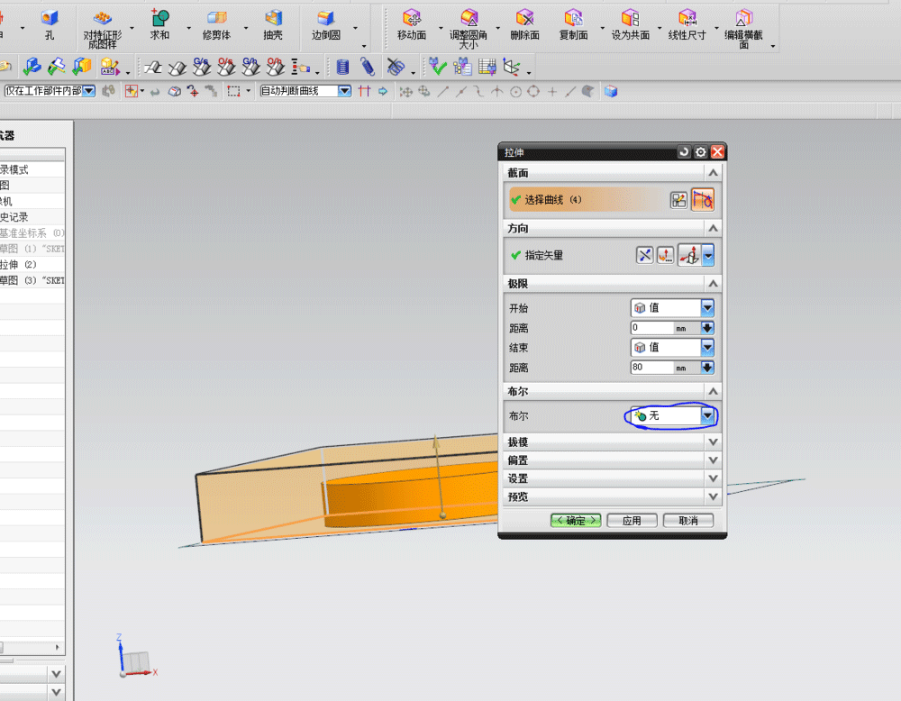 3、拉伸生成實體,注意不要是求和或其他的,選擇無就好了