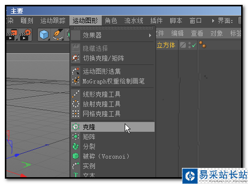 2、然后,在菜單欄中,我們點開:運動圖形,在彈出的菜單中我們找到:克隆