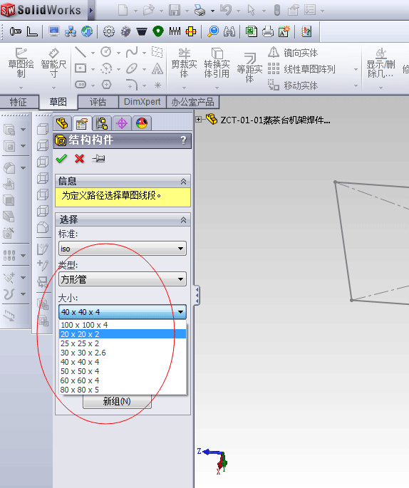 1、打開solidworks軟件,并編輯一草圖,準備用于結構焊件。圖中的尺寸為800*400.(我們以結構焊件為方形管70*70*4.5為例來說明)草圖編輯完后,點擊【插入】---【焊件】---【結構構件】這時候出來如下所示的界面,而在方形管大小的下拉菜單中我們找不到70*70*4.5的方形管,怎么辦?