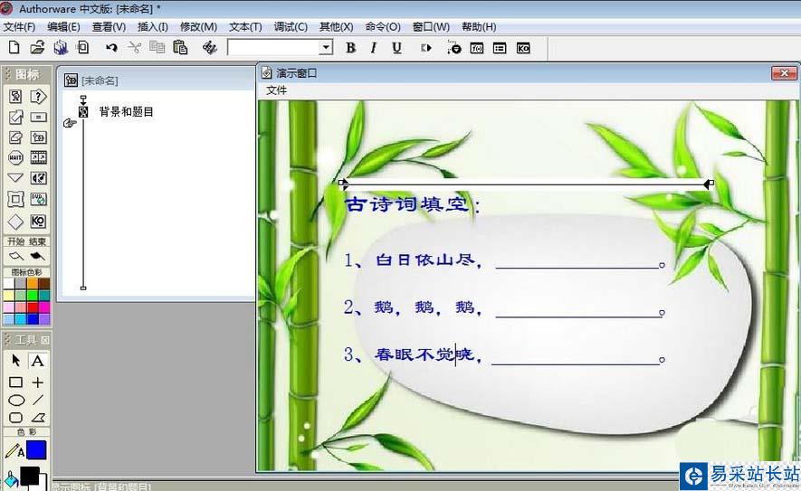 2、雙擊顯示圖標(biāo),在演示窗口里面插入一張圖片作為背景,然后在工具箱里面利用文字工具輸入題目的題干。