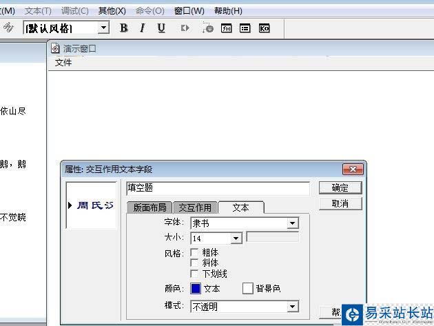 6、雙擊交互圖標(biāo),在演示窗口里面的文本框上雙擊,設(shè)置文本的大小、演示和字體。