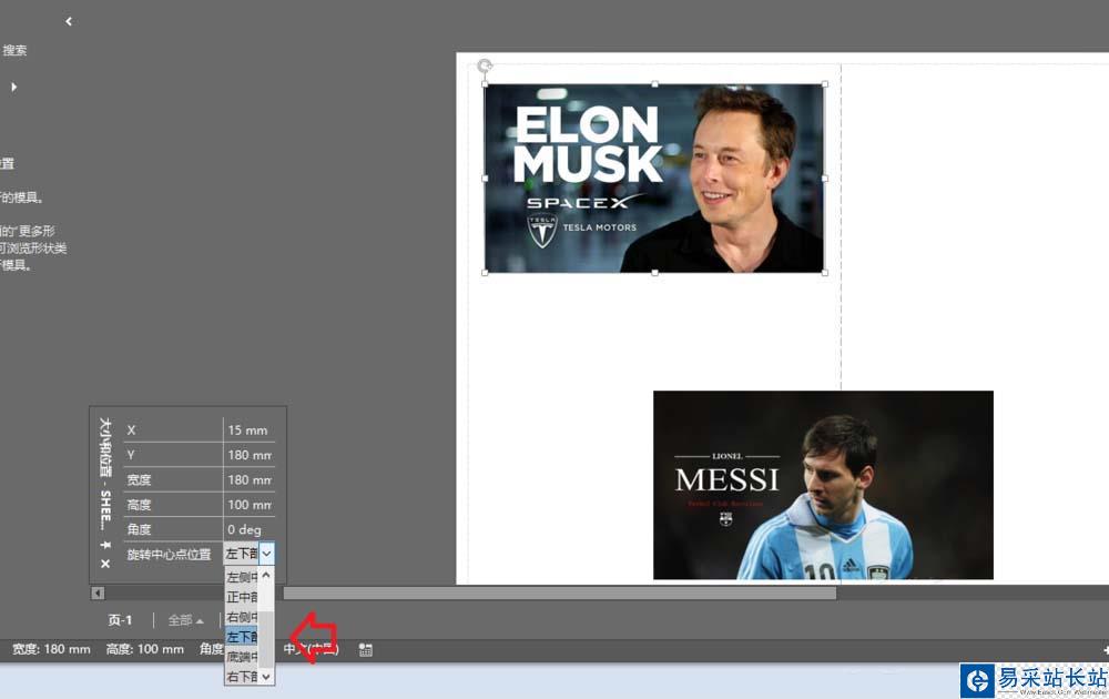 4、下面精確調整圖片間距。點擊上方圖片,旋轉中心位置選擇左下角,XY輸入15mm和180mm。這就是該圖片左下角的坐標。