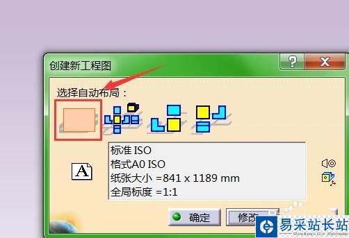 4、在“創建工程圖界面”,紅框所示為當前圖幅大小,單擊“修改”,可在彈窗中修改,即使這里不修改,后面還可以修改。