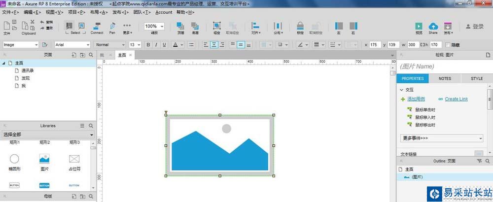 2、axure界面是這樣的,最上面是菜單欄,靠下位置為屬性欄,中間是操作區域,右側有交互效果