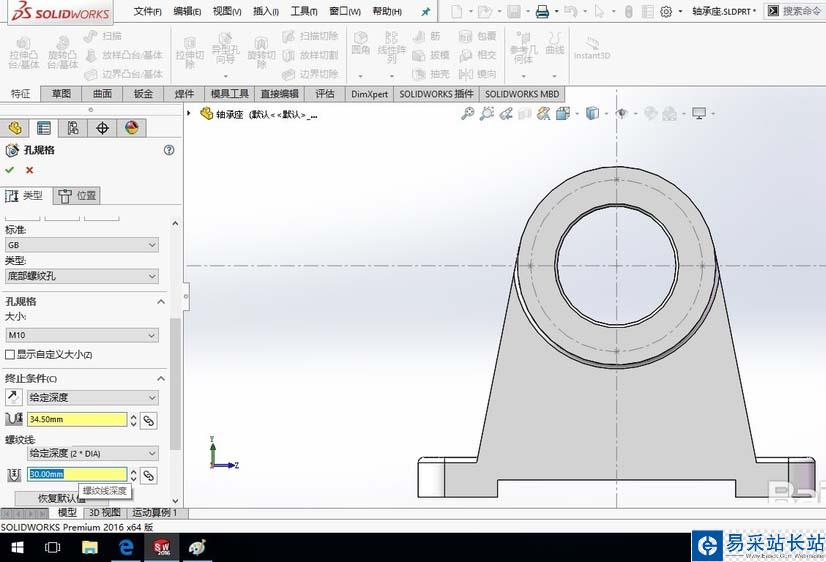 4、單擊特征,“異形孔向導”命令,孔類型選擇“直螺紋孔”,標準為“GB”,螺紋類型為“底部螺紋孔”,大小為“M10”,盲孔深度設置為“34.5 mm”,螺紋線深度設置為“30 mm”。