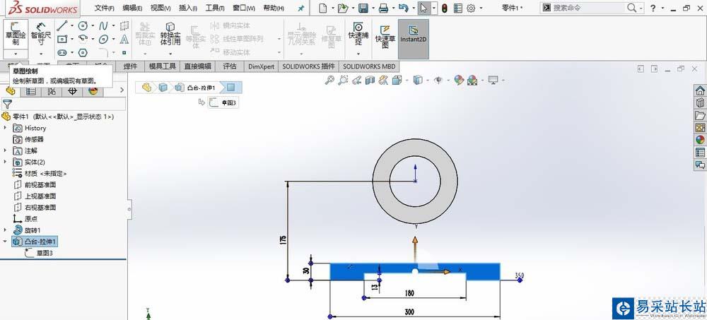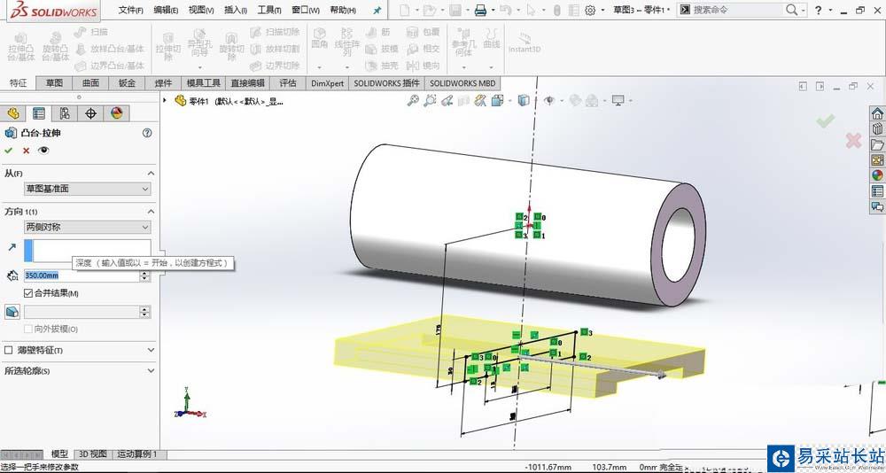 4、單擊特征,“拉伸凸臺/基體”命令,方向選擇“兩側對稱”,深度設置為“350 mm”,單擊確定,完成拉伸凸臺的創建。