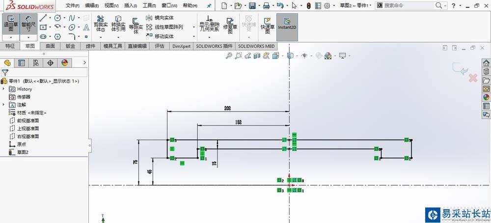 3、正視于右視基準面,在右視基準面上繪制草圖。繪制具有如圖所示幾何關系的草圖。