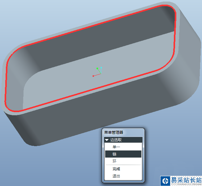 3、系統會打開唇的菜單管理器,“邊選取”項選擇“鏈”,根據提示選取開口端面的內邊,選好后,點擊完成退出“邊選取”。